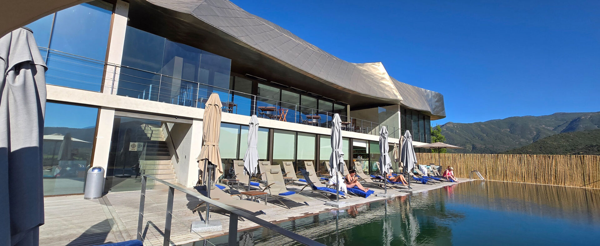 Si el hotel es una declaración estética y de proyección mundial, la bodega es una declaración intelectual. Diseñada por el reconocido arquitecto chileno Smiljan Radic junto con Loreto Lyon, la estructura está parcialmente enterrada y coronada por una cubierta ondulante que parece flotar sobre el terreno.