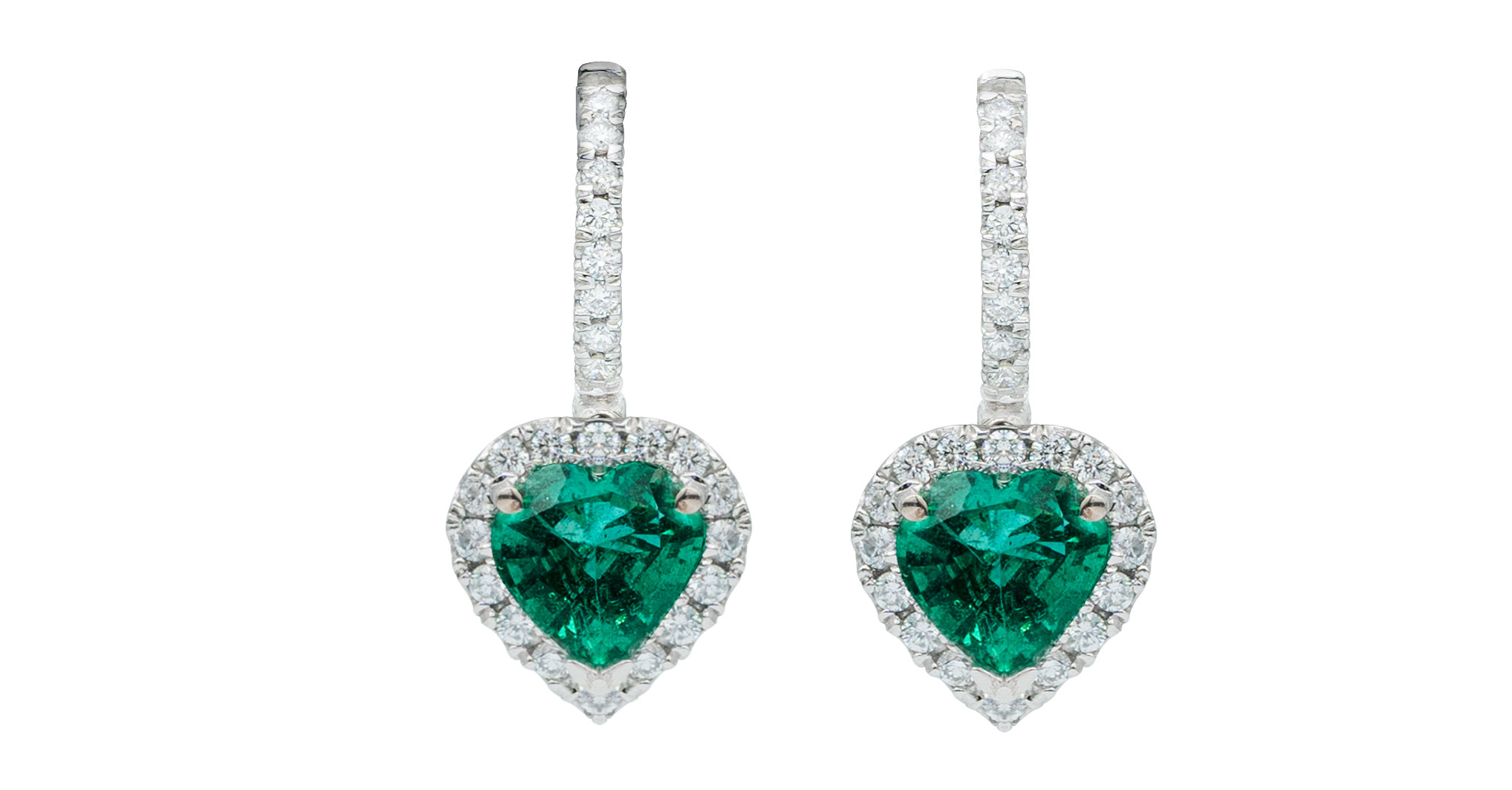 Aretes de esmeralda en forma de corazón de 1,5 quilates, rodeado de diamantes naturales. Diseño y confección de Alessi Joyeros.