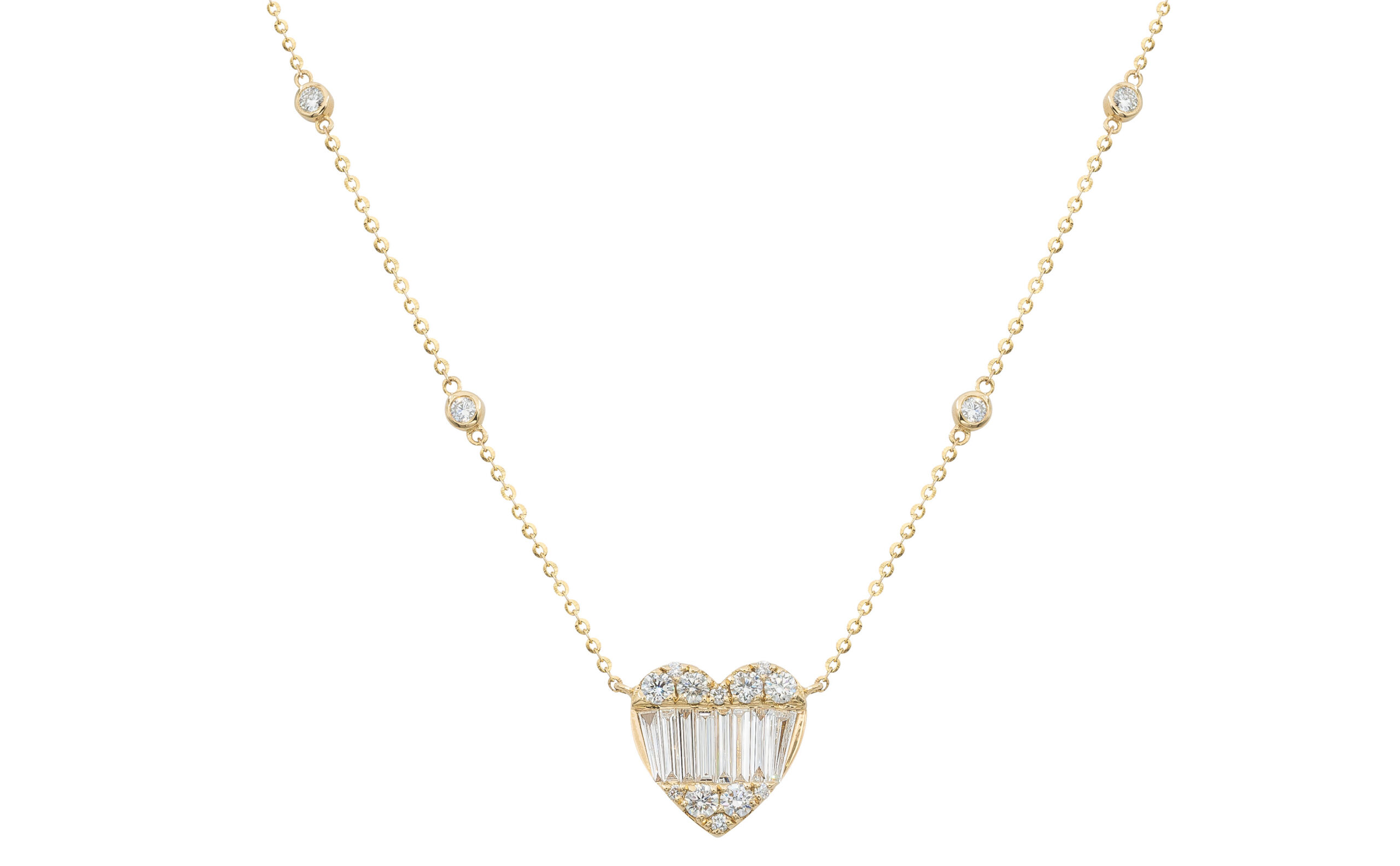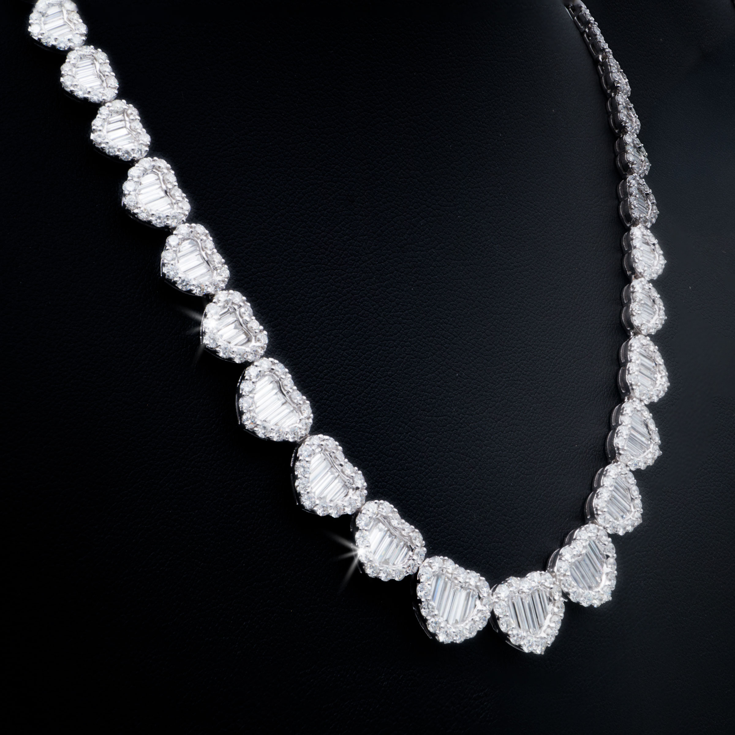 Gargantilla en oro blanco 18k con diamantes naturales en forma de corazón de talla baguette, muy elegantes.