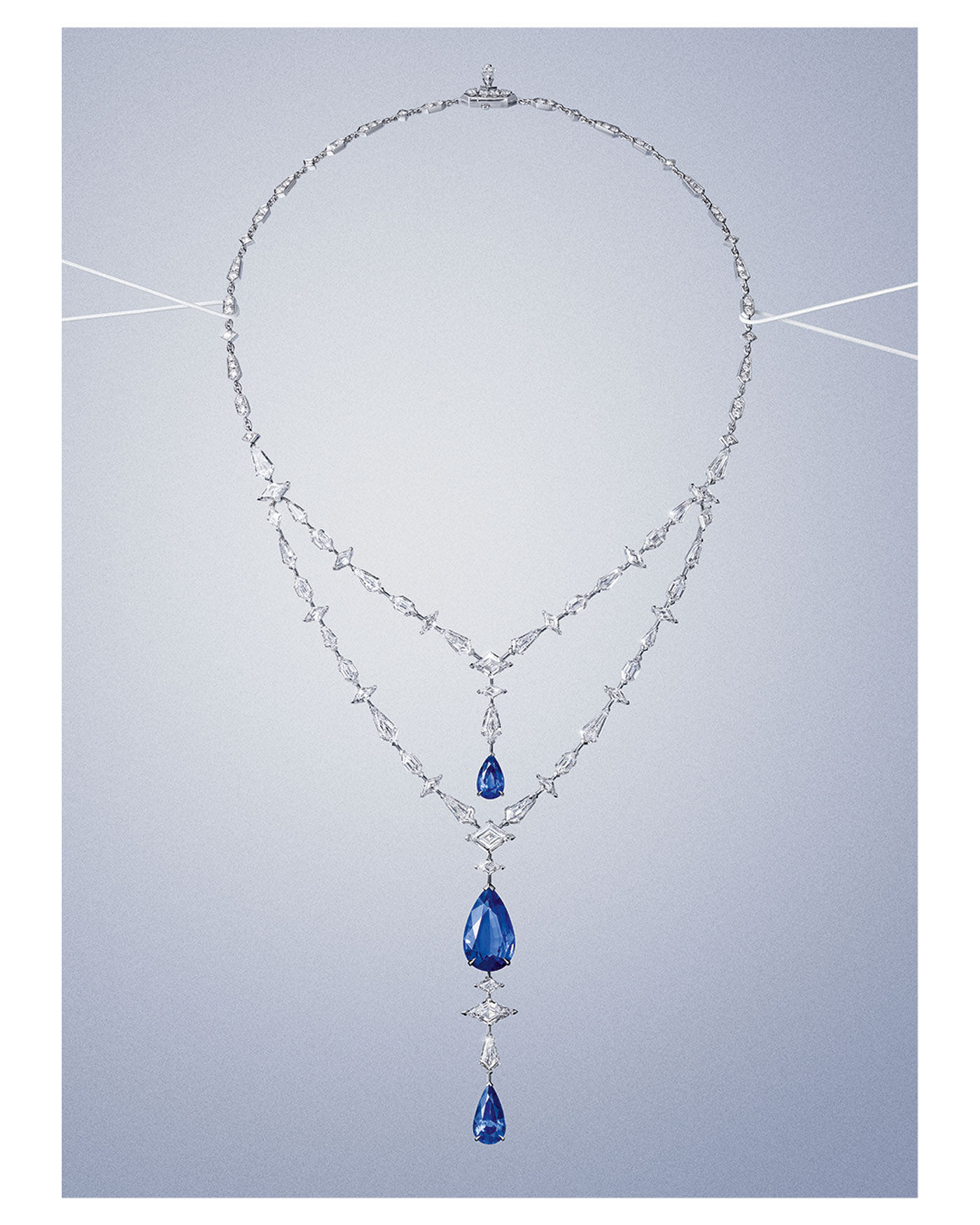 Tres zafiros azul profundo suspendidos en diamantes trazan una línea central sobria y magnética.