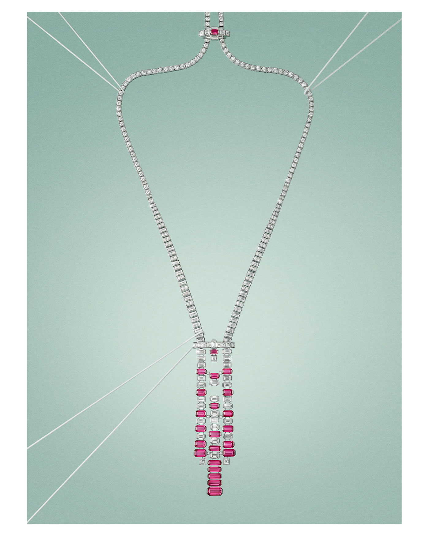 Contraste intenso de rubíes y diamantes que dibujan una estructura gráfica vibrante y profundamente elegante.