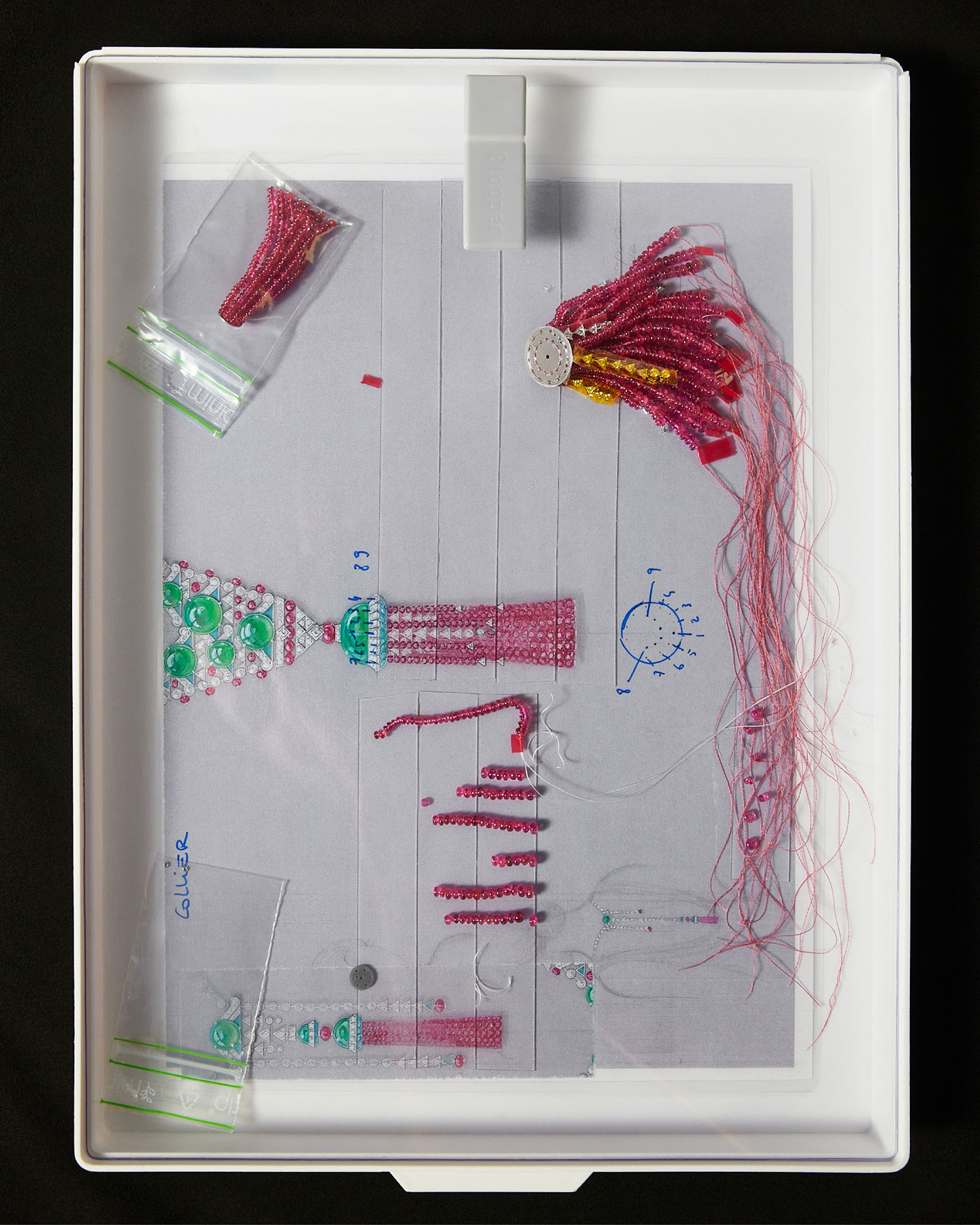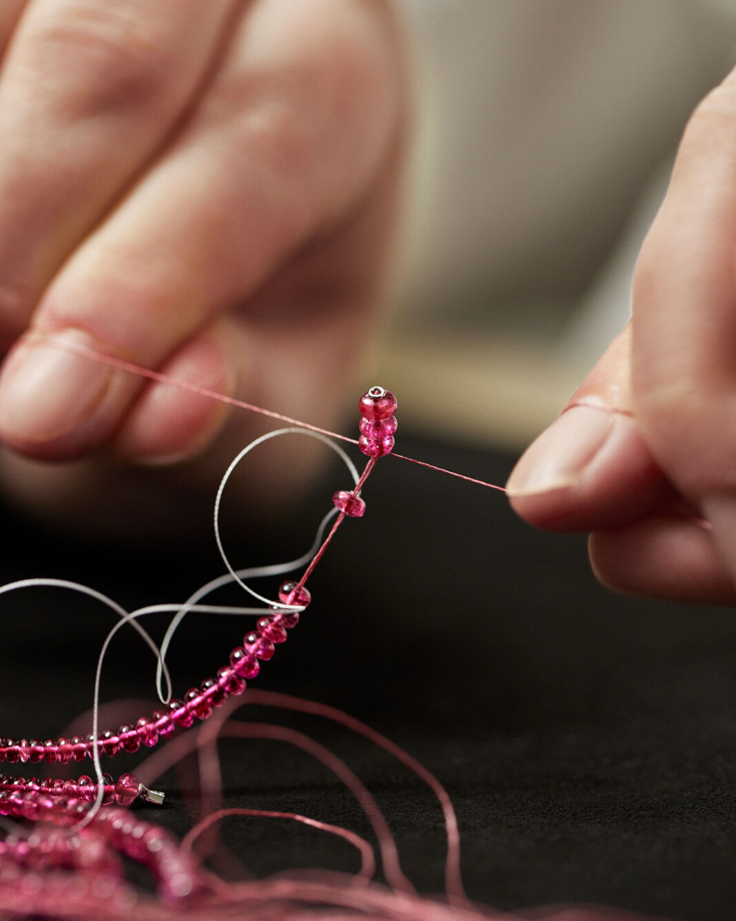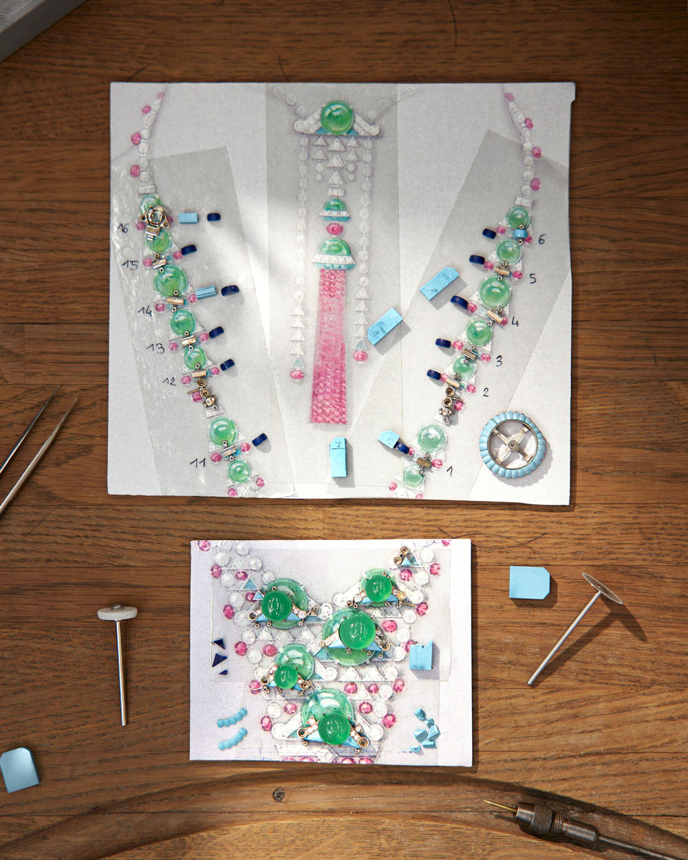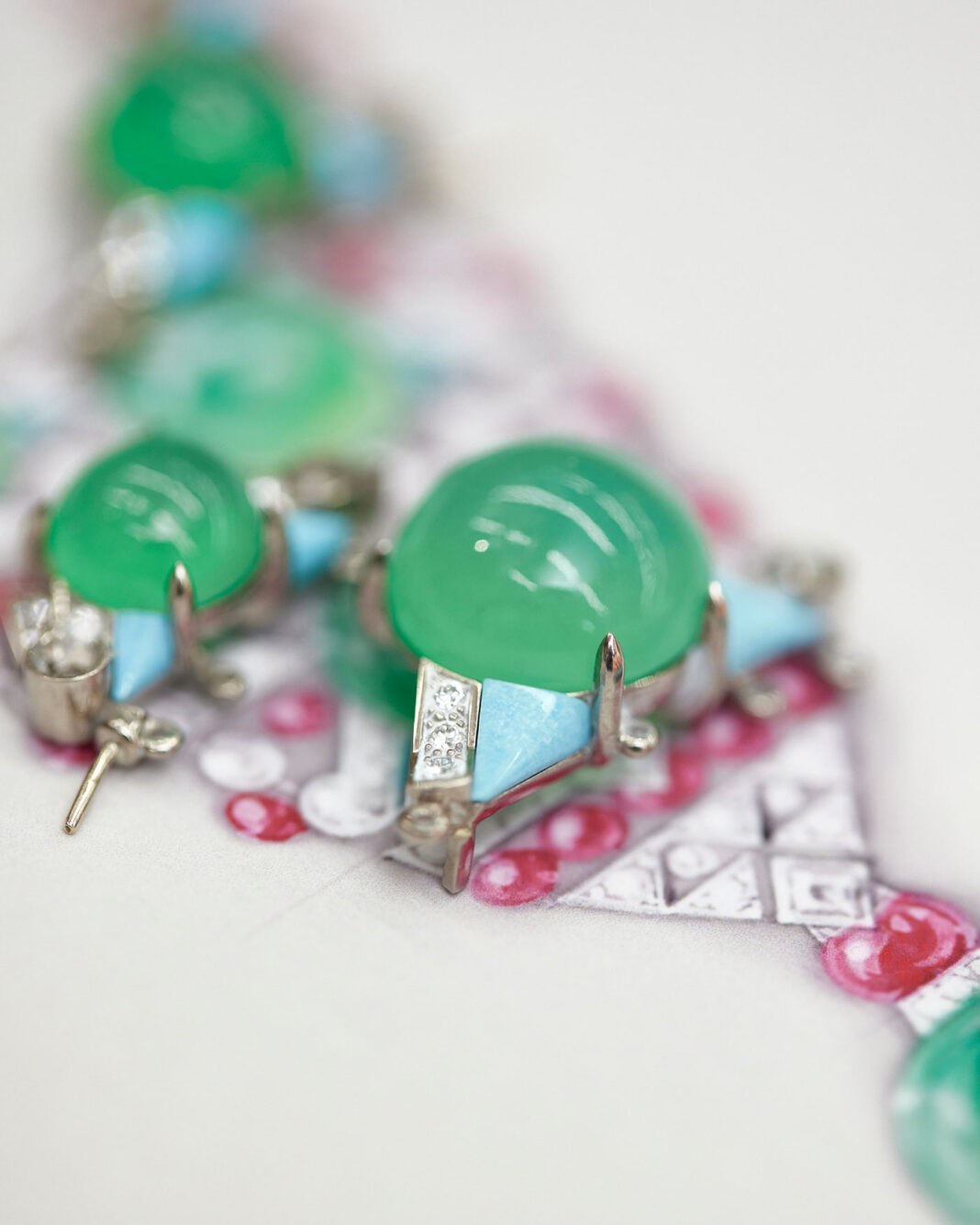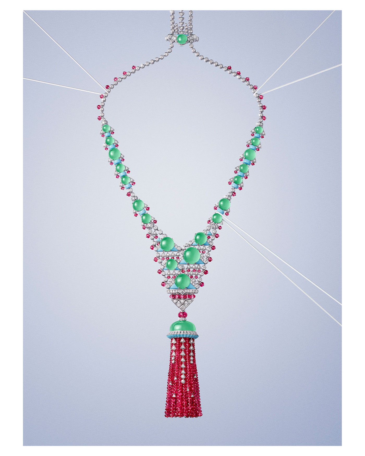 Collares como Euphonia combinan rubíes y diamantes en composiciones geométricas que generan un ritmo vibrante y dinámico. Splendea, construido a partir de 34 diamantes perfectamente calibrados, se despliega como una cinta de luz continua que parece fluir sobre la piel. En Parcae, tres zafiros de Madagascar enmarcan un eje central que ordena toda la composición con precisión casi matemática. Mientras que Ondora, inspirado en el movimiento de las medusas, introduce un lenguaje más orgánico mediante crisoprasas, espinelas y turquesas.