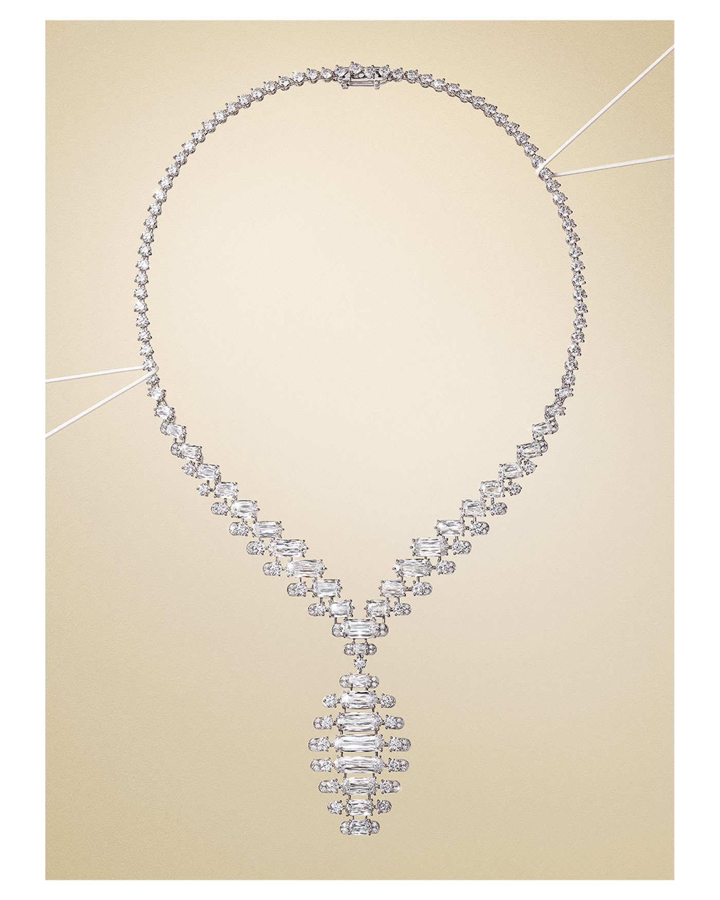 Secuencia de diamantes perfectamente alineados crea un efecto ondulante de luz pura alrededor del cuello.