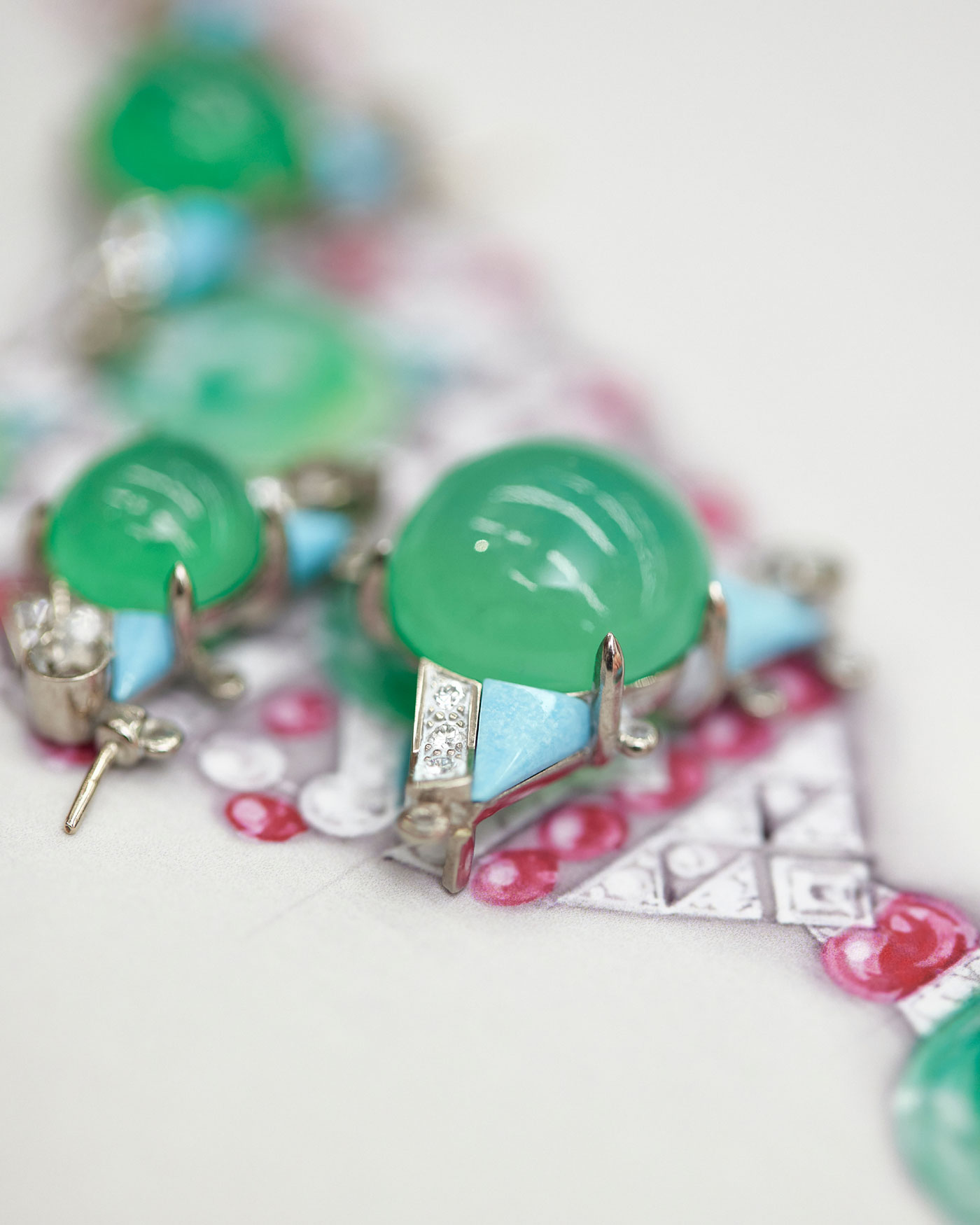 Paleta inesperada de crisoprasa, espinelas y turquesas, evoca movimiento acuático con sensualidad contemporánea.