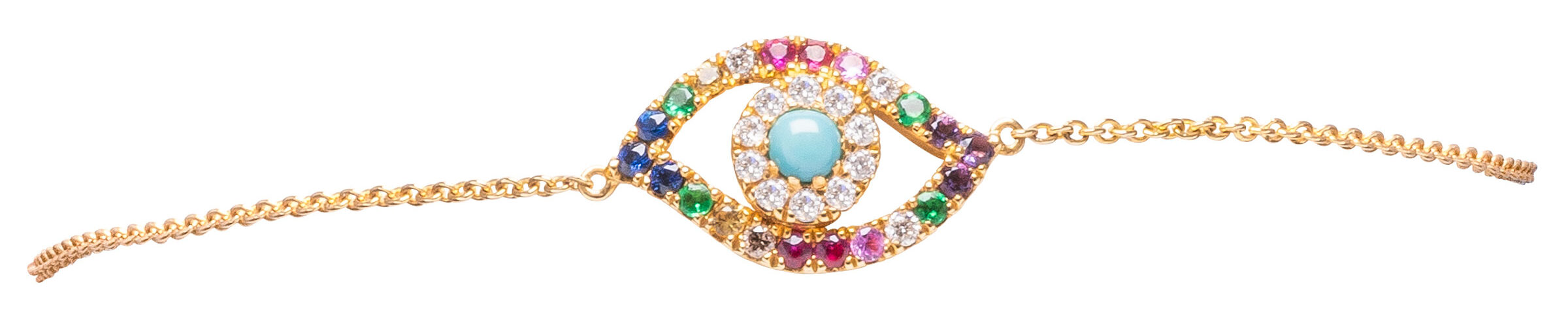 Pulsera en oro amarillo 18k con zafiros multicolor, diamantes y turquesa central, todos estos diseños son exclusivos de Alessi Joyeros.