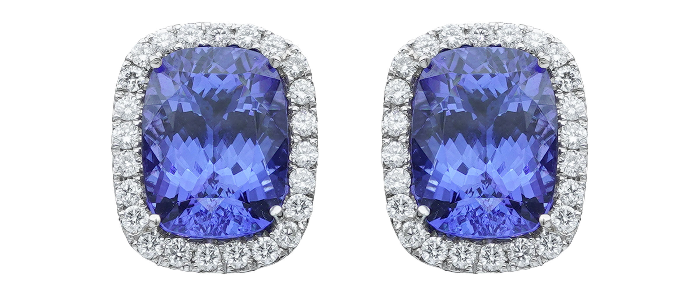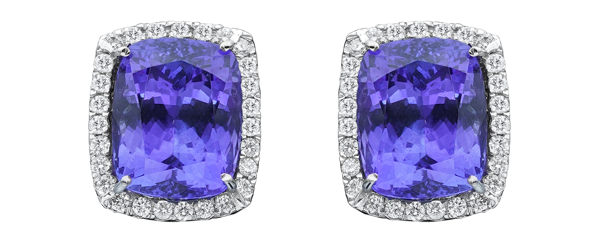 Aretes en oro blanco 18k con diamantes y tanzanitas en corte cushion 36.50 cts, diseños exclusivos de Alessi Joyeros.